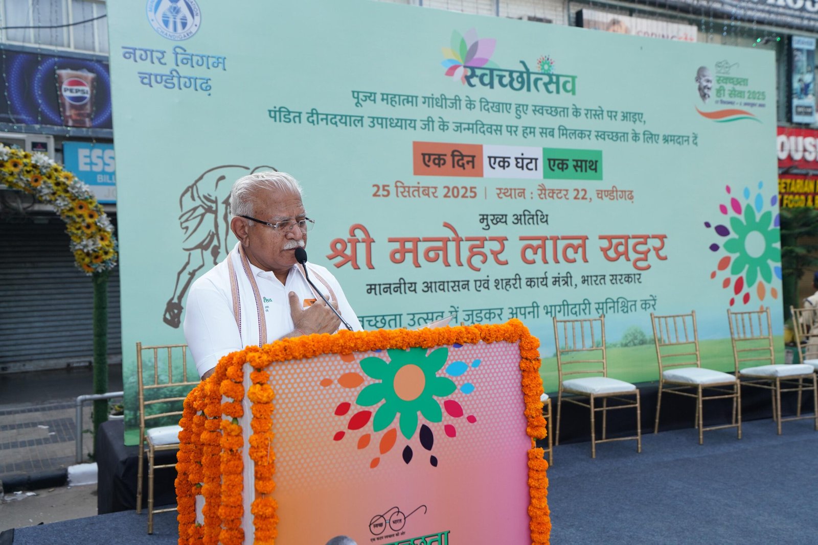 The Union Minister of Housing and Urban Affairs, Shri Manohar Lal Khattar, today participated in the Swachhata Hi Seva – Ek Din, Ek Ghanta, Ek Saath Shramdaan campaign in Sector 22 Market, Chandigarh. The event witnessed enthusiastic participation from officials, citizens, volunteers including Safai Mitras, reaffirming the collective commitment towards the vision of a clean India. A massive Shramdaan activity was undertaken, where participants wholeheartedly joined hands to clean the surroundings.