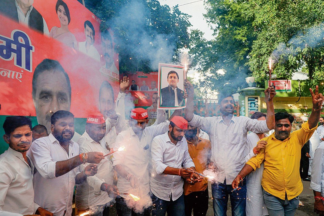 Lucknow: Samajwadi Party workers celebrate the victory of party candidate Sudhakar Singh in the Ghosi constituency by-election, in Lucknow, Friday, Sept. 8, 2023. (PTI Photo/Nand Kumar)(PTI09_08_2023_000347B)