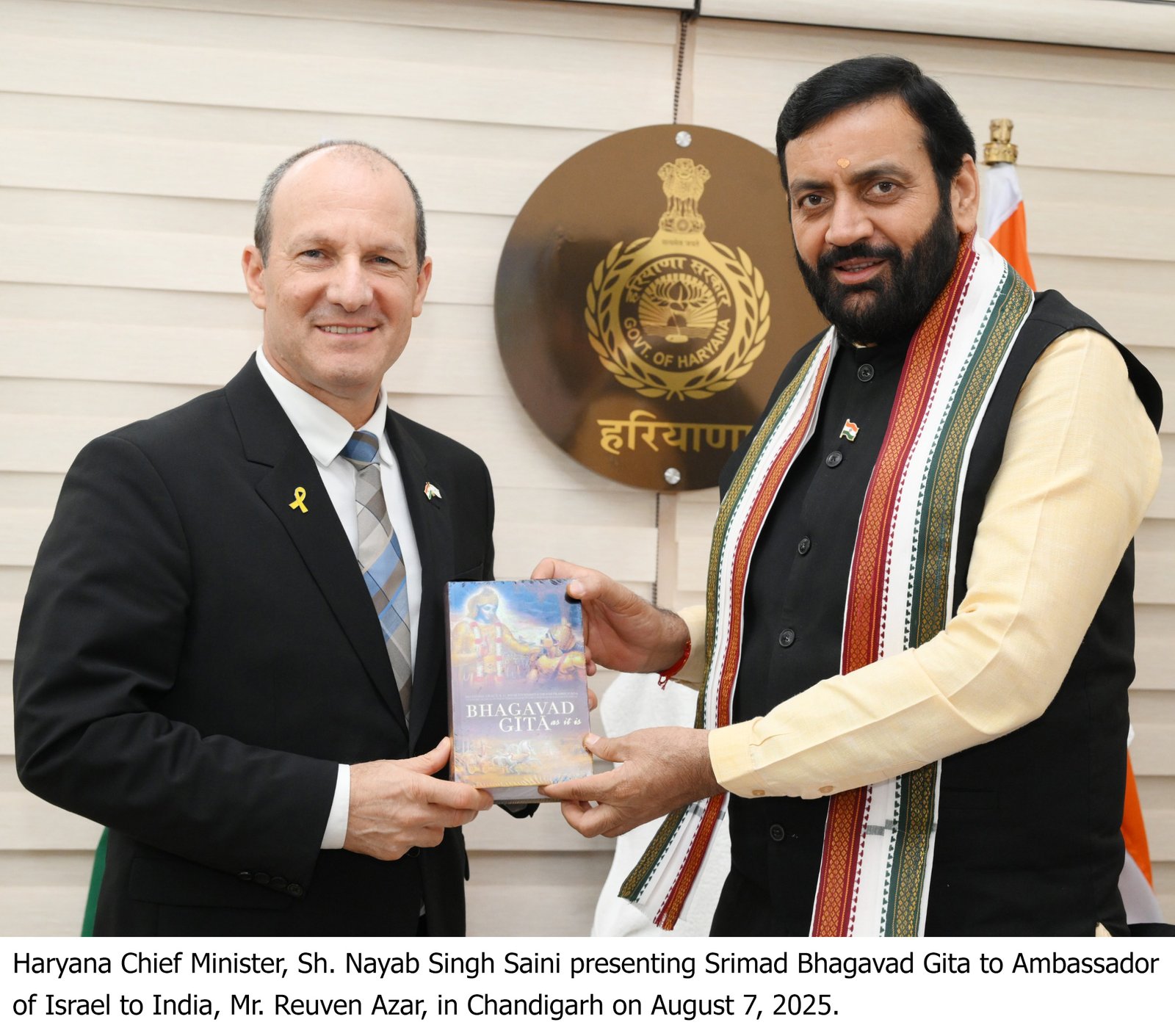 इस दौरान, मुख्यमंत्री ने इज़राइली राजदूत रूबेन अजार को गीता की एक प्रति भेंट की। इस अवसर पर मुख्यमंत्री के प्रधान सचिव श्री अरूण कुमार गुप्ता, हरियाणा विदेश सहयोग विभाग की आयुक्त एवं सचिव श्रीमती अमनीत पी. कुमार तथा विदेश सहयोग विभाग के सलाहकार श्री पवन चौधरी उपस्थित थे।