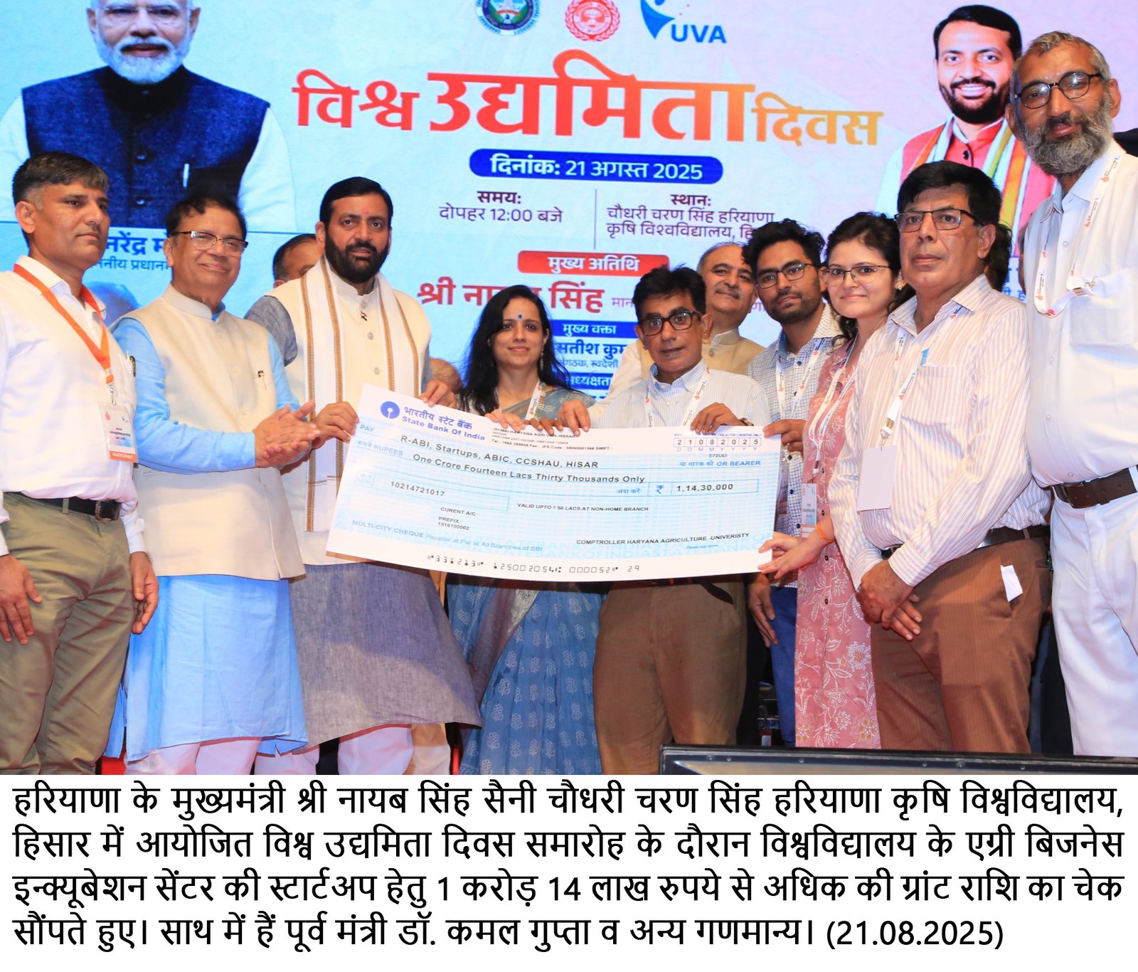 मुख्यमंत्री श्री नायब सिंह सैनी ने विश्व उद्यमिता दिवस के अवसर पर चौधरी चरण सिंह हरियाणा कृषि विश्वविद्यालय, हिसार में आयोजित राज्य स्तरीय कार्यक्रम को संबोधित करते हुए कई अन्य घोषणाएँ कीं। इस अवसर पर जन स्वास्थ्य अभियांत्रिकी मंत्री श्री रणबीर गंगवा और युवा सशक्तिकरण एवं उद्यमिता मंत्री श्री गौरव गौतम भी उपस्थित थे। कार्यक्रम में राज्य भर के विभिन्न विश्वविद्यालयों, महाविद्यालयों, स्कूलों और औद्योगिक प्रशिक्षण संस्थानों के लगभग 2,000 छात्रों के साथ-साथ विभिन्न क्षेत्रों के लगभग 100 सफल उद्यमियों ने भाग लिया।