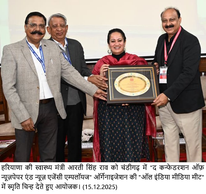 स्वास्थ्य मंत्री आज चंडीगढ़ में “द कन्फेडरशन ऑफ़ न्यूज़पेपर एंड न्यूज़ एजेंसी एम्पलॉयज” ऑर्गेनाइजेशन की “ऑल इंडिया मीडिया मीट” में बतौर मुख्य अतिथि बोल रही थी।