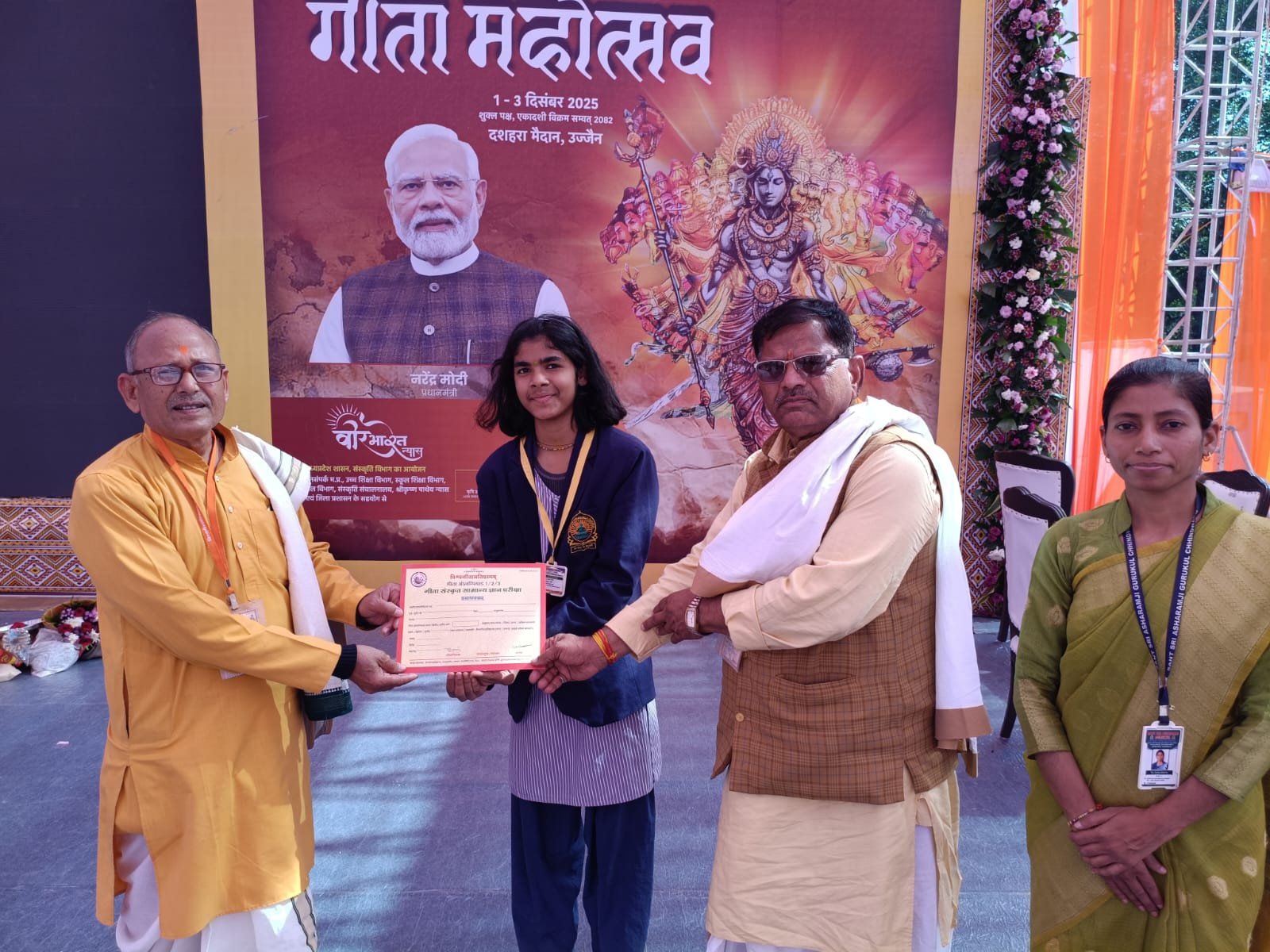 छिंदवाड़ा(भगवानदीन् साहू)- शिक्षा एवं उत्तम संस्कार के लिए ख्याति प्राप्त सन्त श्री आशारामजी गुरुकुल के विद्यार्थियों ने विश्व गीता प्रतिष्ठानम द्वारा आयोजित संस्कृत गीता ज्ञान प्रतियोगिता में राष्ट्रीय स्तर की प्रतियोगिता में प्रथम स्थान प्राप्त किया है । इस अवसर पर गुरुकुल की संचालिका दर्शना खट्टर ने बताया कि आध्यात्मिक शिक्षा और आधुनिक शिक्षा के समन्वय के कारण विद्यार्थियों की योग्यता में निखार आता हैं । समय-समय पर हमारे बच्चों ने पूरे विश्व में जिले को गौरान्वित किया है ।अनुभूति सिंह पिता बिपिन सिह दिल्ली कक्षा 8 की छात्रा हैं। इन्होंने पूरे देश भर के अन्य बच्चों को पीछे छोड़कर प्रथम स्थान पाया जिसपर उन्हें 11 हजार रुपये नगद प्राप्त हुए । इसी कड़ी में संस्कृत ओलम्पियाड में धारणी मिश्रा पिता वीरेन्द्र मिश्रा छिंदवाड़ा 5100/- , अभी केसरवानी पिता सुरेश केसरवानी रीवा मप्र 3000/- रुपये नगद और 17 विद्यार्थियों को संस्कृत छात्रवृत्ति 5 – 5 हजार रुपये प्राप्त हुई हैं । संस्कृत हमारी देव भाषा है । आयोजन कर्ता ने गुरुकुल के विद्यार्थियों के संस्कृत भाषा के ज्ञान की जमकर सराहना की । माननीय मुख्यमंत्री द्वारा आयोजित अंतर्राष्ट्रीय गीता ज्ञान प्रतियोगिता में गोविंद सिंह पिता सुमन सिह बिहार ( कक्षा 7 वीं) को 32 हजार रुपए एवं आनन्द कुमार का पुरस्कार के लिए चयन हुआ ।सनद रहे उक्त गुरुकुल में देश के लगभग 24 राज्यो के विद्यार्थी अध्ययनरत है । म.प्र. के मुख्यमंत्री 26 जनवरी को उज्जैन में इन बच्चों को पुरुस्कार देकर सम्मानित करेंगे । इस खुशी के अवसर पर खजरीं आश्रम के संचालक जयराम भाई , गुरुकुल की संचालिका दर्शना खट्टर , समिति के अध्यक्ष मदनमोहन परसाई , पूजा आम्रवंशी , सुशील सिंह परिहार , छात्रावास प्रभारी सोमनाथ पवार , संस्कृत विभाग और समस्त शिक्षण स्टॉफ़ ने शुभाशीष प्रदान किया है ।