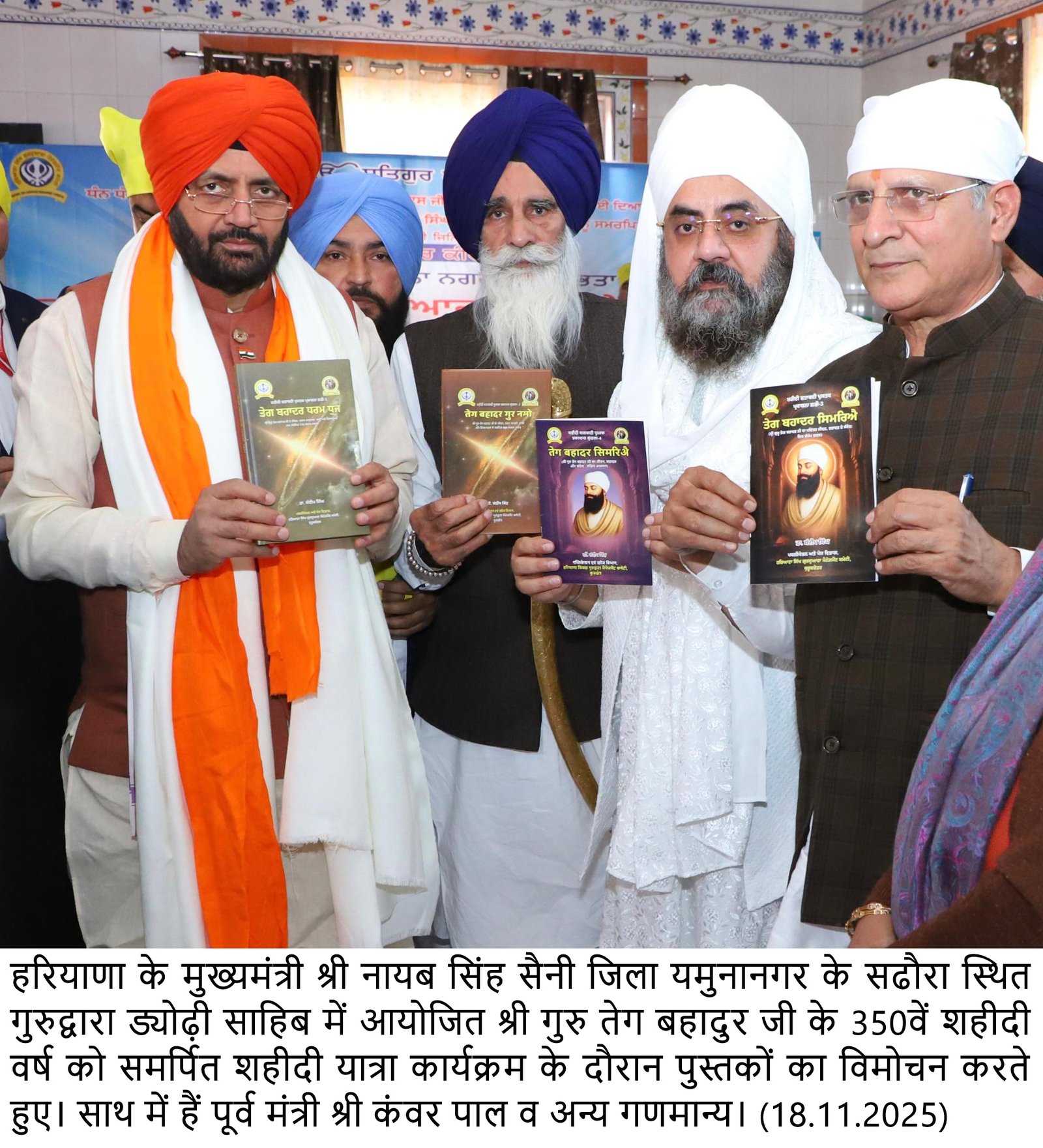 चंडीगढ़, 18  नवंबर -‘हिंद की चादर’ श्री गुरु तेग बहादुर जी के 350वें शहीदी वर्ष के पावन अवसर पर हरियाणा के यमुनानगर जिले के सढौरा से चौथी पवित्र नगर कीर्तन यात्रा का भव्य शुभारंभ किया गया। इस अवसर पर हरियाणा के मुख्यमंत्री श्री नायब सिंह सैनी ने गुरुद्वारा ड्योढी साहिब में श्री गुरु ग्रंथ साहिब के समक्ष अरदास करते हुए श्री गुरु तेग बहादुर जी के तप-त्याग का संदेश जन-जन तक पहुँचाने का आह्वान  किया। कार्यक्रम के दौरान मुख्यमंत्री ने अपने ऐच्छिक कोटे से गुरुद्वारा ड्योढी साहिब को 31 लाख रुपये देने की भी घोषणा की।
