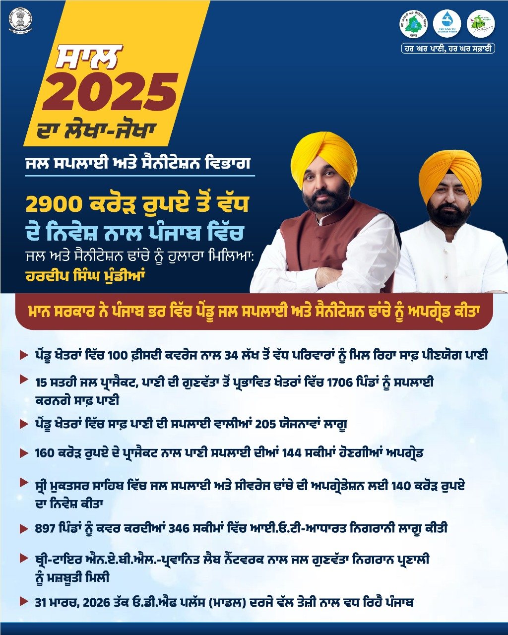 ਪੰਜਾਬ ਦੇ ਜਲ ਸਪਲਾਈ ਅਤੇ ਸੈਨੀਟੇਸ਼ਨ ਮੰਤਰੀ ਸ. ਹਰਦੀਪ ਸਿੰਘ ਮੁੰਡੀਆਂ ਨੇ ਦੱਸਿਆ ਕਿ ਮੁੱਖ ਮੰਤਰੀ ਸ. ਭਗਵੰਤ ਸਿੰਘ ਮਾਨ ਦੀ ਅਗਵਾਈ ਵਾਲੀ ਪੰਜਾਬ ਸਰਕਾਰ ਨੇ ਪੰਜਾਬ ਭਰ ਵਿੱਚ ਜਲ ਸਪਲਾਈ ਅਤੇ ਸੈਨੀਟੇਸ਼ਨ ਬੁਨਿਆਦੀ ਢਾਂਚੇ ਨੂੰ ਮਜ਼ਬੂਤੀ ਦੇਣ ਲਈ 2,900 ਕਰੋੜ ਰੁਪਏ ਤੋਂ ਵੱਧ ਦਾ ਨਿਵੇਸ਼ ਕੀਤਾ ਹੈ। ਉਨ੍ਹਾਂ ਕਿਹਾ ਕਿ ਇਸ ਵੱਡੇ ਨਿਵੇਸ਼ ਨਾਲ ਪ੍ਰਮੁੱਖ ਪ੍ਰਾਜੈਕਟਾਂ ਨੂੰ ਜਲਦ ਮੁਕੰਮਲ ਕਰਨ, ਨਵੀਨ ਤਕਨਾਲੋਜੀ ਦੇ ਵਿਸਥਾਰ ਅਤੇ ਪਾਣੀ ਦੀ ਗੁਣਵੱਤਾ ਅਤੇ ਸੈਨੀਟੇਸ਼ਨ ਪ੍ਰਣਾਲੀਆਂ ਨੂੰ ਮਜ਼ਬੂਤੀ ਦੇਣ ਵਿੱਚ ਵੱਡੀ ਮਦਦ ਮਿਲੀ ਹੈ, ਜਿਸ ਦੇ ਨਤੀਜੇ ਵਜੋਂ ਪੇਂਡੂ ਅਤੇ ਅਰਧ-ਸ਼ਹਿਰੀ ਖੇਤਰਾਂ ਵਿੱਚ ਲੋਕਾਂ ਦੇ ਰੋਜ਼ਾਨਾ ਜੀਵਨ ਪੱਧਰ ਵਿੱਚ ਕਾਫ਼ੀ ਸੁਧਾਰ ਹੋਇਆ ਹੈ। ਉਨ੍ਹਾਂ ਕਿਹਾ ਕਿ 100 ਫ਼ੀਸਦੀ ਕਵਰੇਜ ਨਾਲ ਇਸ ਸਮੇਂ ਸੂਬੇ ਵਿੱਚ 34 ਲੱਖ ਤੋਂ ਵੱਧ ਪਰਿਵਾਰਾਂ ਨੂੰ ਸੁਰੱਖਿਅਤ ਅਤੇ ਸਾਫ਼ ਪੀਣਯੋਗ ਪਾਣੀ ਮਿਲ ਰਿਹਾ ਹੈ। ਕੈਬਨਿਟ ਮੰਤਰੀ ਨੇ ਦੱਸਿਆ ਕਿ ਪੰਜਾਬ ਸਰਕਾਰ ਵੱਲੋਂ ਵਿੱਤੀ ਸਾਲ 2025-26 ਲਈ ਪੇਂਡੂ ਵਿਕਾਸ ਵਾਸਤੇ ਸੈਨੀਟੇਸ਼ਨ ਖੇਤਰ ਹਿੱਤ 2,190.80 ਕਰੋੜ ਰੁਪਏ ਦੀ ਸਾਲਾਨਾ ਯੋਜਨਾ ਨੂੰ ਮਨਜ਼ੂਰੀ ਦਿੱਤੀ ਗਈ ਹੈ।