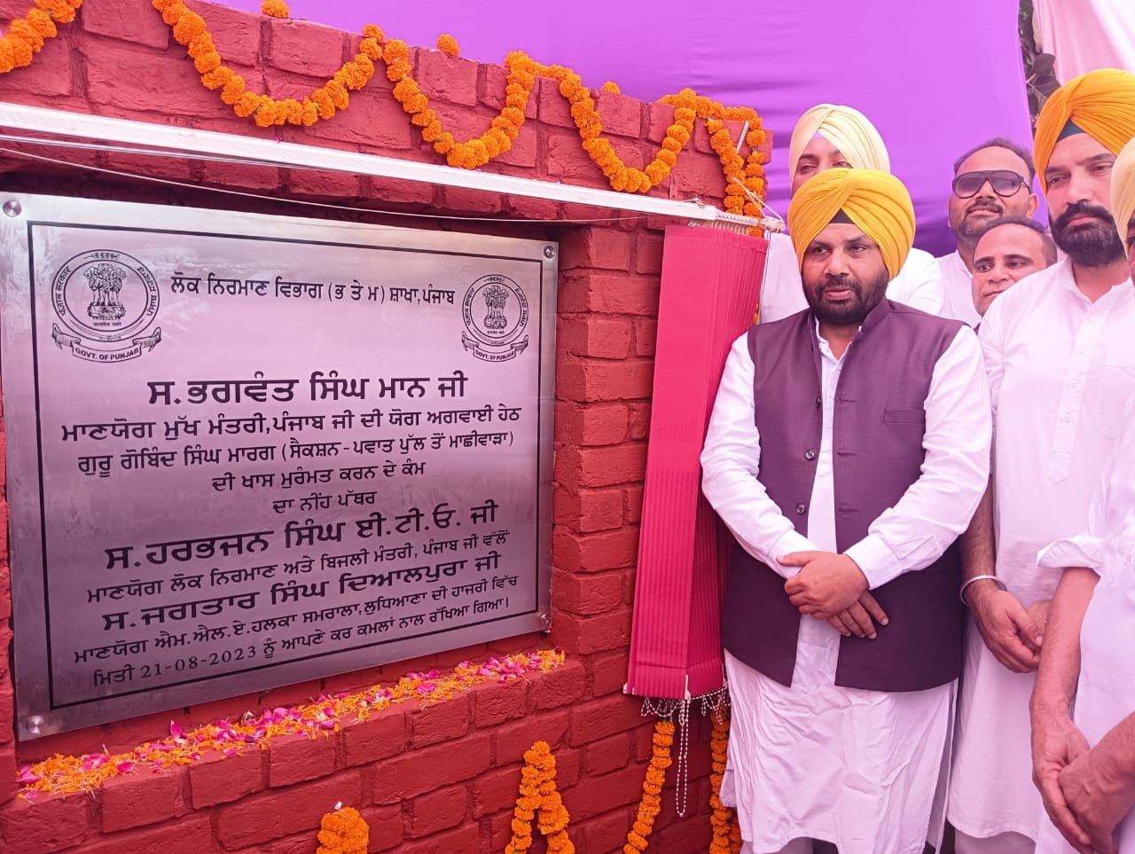 ਪੰਜਾਬ ਦੇ ਲੋਕ ਨਿਰਮਾਣ ਅਤੇ ਬਿਜਲੀ ਮੰਤਰੀ ਹਰਭਜਨ ਸਿੰਘ ਈ.ਟੀ.ਓ ਨੇ ਅੱਜ ਲੁਧਿਆਣਾ ਜ਼ਿਲ੍ਹੇ ਦੇ ਸਮਰਾਲਾ ਹਲਕੇ ਵਿੱਚ ਪੈਂਦੇ 11.93 ਕਰੋੜ ਰੁਪਏ ਦੀ ਲਾਗਤ ਵਾਲੇ ਦੋ ਮਹੱਤਵਪੂਰਨ ਸੜਕੀ ਪ੍ਰੋਜੈਕਟਾਂ ਦੀ ਵਿਸ਼ੇਸ਼ ਮੁਰੰਮਤ ਅਤੇ ਪੁਨਰ ਨਿਰਮਾਣ ਲਈ ਨੀਂਹ ਪੱਥਰ ਰੱਖਿਆ।