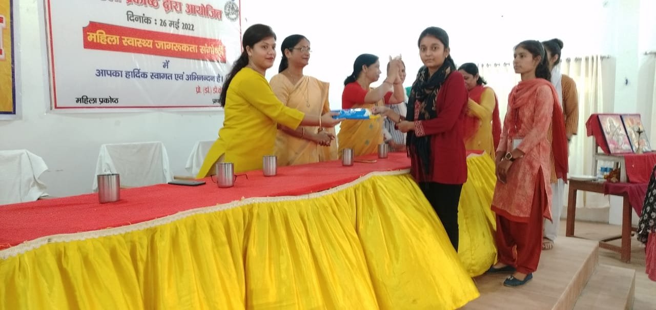 सुल्तानपुर। राणा प्रताप स्नातकोत्तर महाविद्यालय एवं अखिल भारतीय मारवाड़ी युवा मंच ( गोमती शाखा) के संयुक्त तत्वावधान में महिला स्वास्थ्य जागरूकता संगोष्ठी का आयोजन राणा प्रताप पी जी कालेज में हुआ। कार्यक्रम का शुभारंभ उप प्राचार्या डॉ निशा सिंह , रचना मोरारक, नेहा कानोडिया, द्वारा माँ सरस्वती और राणा प्रताप के चित्रों पर माल्यार्पण तथा दीप प्रज्ज्वलन से हुवा। स्वास्थ्य जागरूकता संगोष्ठी को संबोधित करते हुए डॉ निशा सिंह से कहा कि सभी क्षेत्रों और पेशे में महिलाओं का योगदान दिन-ब-दिन बढ़ रहा है। परिवार के साथ महिलाओं को अपने स्वास्थ्य का ख्याल रखने की जरूरत है। विद्यालयों में स्वास्थ्य जांच शिविर आयोजित करते रहना चाहिए। महिलाओं को उनके सामने आने वाली विभिन्न स्वास्थ्य समस्याओं के बारे में जागरूक किया जाना चाहिए। महिलाओं को किसी भी स्वास्थ्य समस्या के निदान हेतु स्वयं निःसंकोच आगे आना चाहिये। उन्होंने यह भी बताया की फल और सब्जी जिनसे विटामिन एवं खनिज लवण मिलते हैं का अधिक सेवन करना चाहिए । मंजू ठाकुर ने कहा कि भोजन के तीन मुख्य घटक कार्बोहाइड्रेट, वसा, प्रोटीन, सूक्ष्म तत्व जैसे विटामिन, हारर्मोंस और खनिज लवण सब को मिलाकर ही एक संतुलित आहार होता है । भोजन में मुख्य रूप से कार्बोहाइड्रेट को लिया जा रहा है। इसकी मात्रा सीमित होनी चाहिए। प्रोटीन का ज्यादा से ज्यादा सेवन करना चाहिए। दाल, दूध, पनीर, मशरूम, मांस आदि प्रोटीन में मुख्य स्रोत है। प्रोटीन एक ग्राम प्रति एक किलोग्राम शरीर भार तथा कठिन कार्य करने वालों के लिए डेढ़ ग्राम प्रति किलोग्राम शरीर भार पर लेना चाहिए। मारवाड़ी युवा मंच की महामंत्री नेहा कानोडिया ने युवा अवस्था की ओर बढ़ती हुई बच्चियों के मासिक चक्र में होने वाले समस्याओं पर प्रकाश डाला और यह बताया कि कब इसे सामान्य और कब इसे असामान्य समझें। उन्होंने स्तन कैंसर व बच्चेदानी में कैंसर के लक्षण के बारे में बताया। इस दौरान दो सौ पचास छात्राओं को मुफ्त में सेनिटरी नैपकिन बांटा गया। कार्यक्रम का संचालन प्रीति प्रकाश ने किया। यह कार्यक्रम डॉ निशा सिंह की अध्यक्षता में हुआ। यहाँ पर डॉ सीमा सिंह, डॉ अंजना सिंह, प्रीति सिंह, डॉ संतोष अंश, रवि सिंह के साथ महाविद्यालय की सैकड़ो छात्राएं उपस्थित थी।