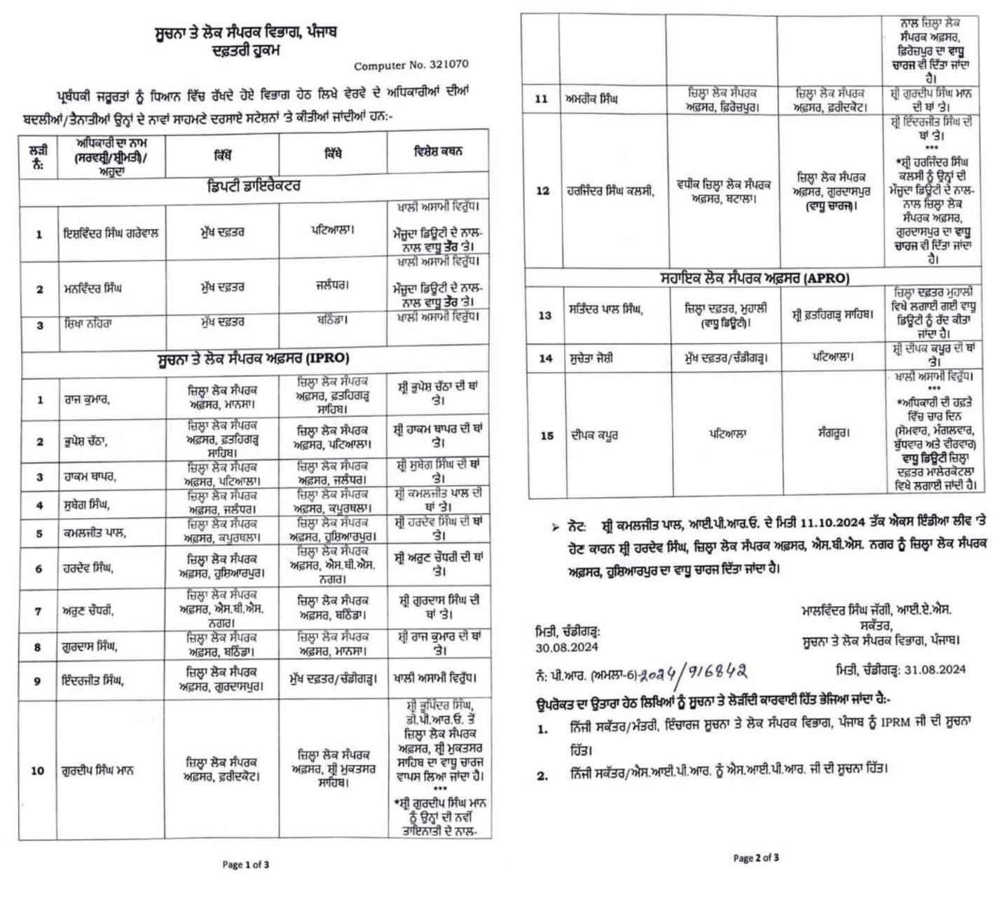 ਪੰਜਾਬ ਸਰਕਾਰ ਨੇ ਅਧਿਕਾਰੀਆਂ ਦੇ ਤਬਾਦਲੇ ਦਾ ਕੰਮ ਜਾਰੀ ਰੱਖਿਆ ਹੈ। ਇਸ ਦੇ ਤਹਿਤ, ਲੋਕ ਸੰਪਰਕ ਵਿਭਾਗ ਦੇ 3 ਡਿਪਟੀ ਡਾਇਰੈਕਟਰਾਂ ਅਤੇ 15 DPROਆਂ ਦੇ ਤਬਾਦਲੇ ਕੀਤੇ ਗਏ ਹਨ, ਨਾਲ ਹੀ ਕੁਝ ਹੋਰ ਅਧਿਕਾਰੀਆਂ ਨੂੰ ਵਾਧੂ ਚਾਰਜ ਵੀ ਦਿੱਤੇ ਗਏ ਹਨ।